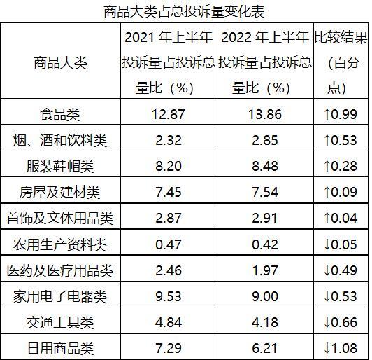按商品种类来分,涉及食品类、家用电子电器类和服装鞋帽类的消费者投诉居前三位。与2021年同期相比,食品类,烟、酒和饮料类,服装鞋帽类等的投诉呈上升趋势,而日用商品类、交通工具类、家用电子电器类等呈下降趋势。