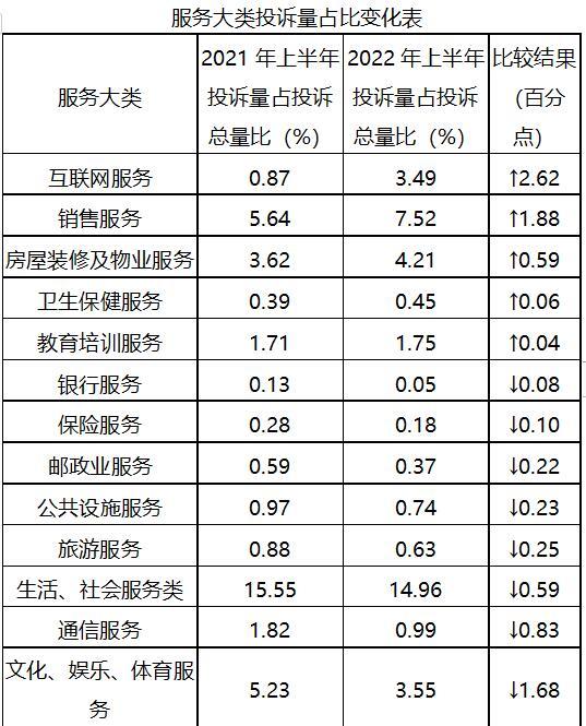按服务种类来分,涉及生活、社会服务类,销售服务,房屋装修及物业服务的消费者投诉居前三位。与2021年同期相比,互联网服务,销售服务,房屋装修及物业服务等的投诉呈上升趋势,而文化、娱乐、体育服务,通信服务,生活、社会服务类等呈下降趋势。