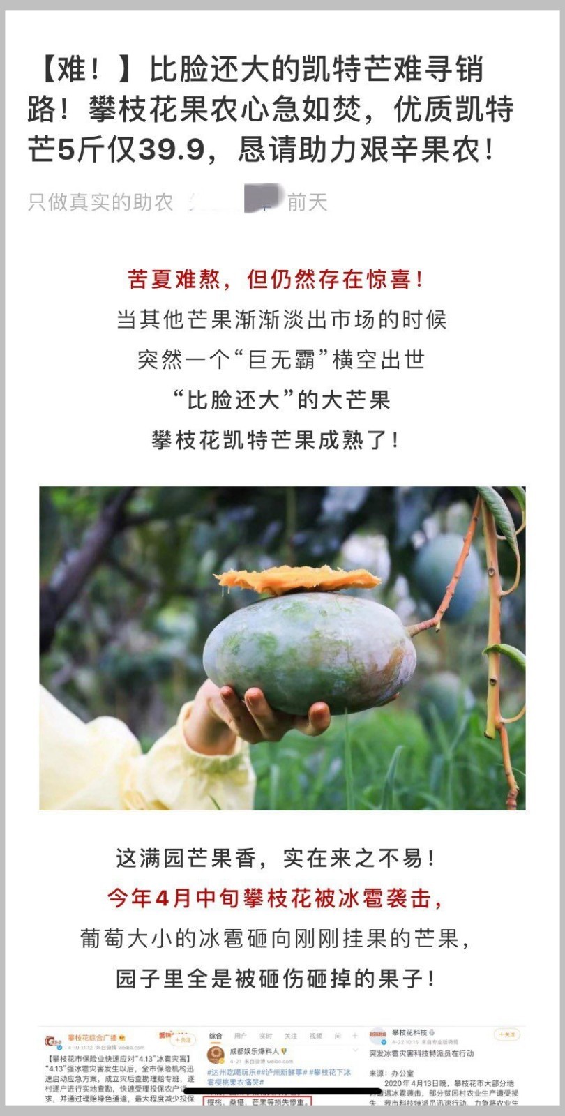 先来看题目《比脸还大的凯特芒难寻销路!攀枝花果农心急如焚,优质凯特芒5斤仅39.9,恳请助力艰辛果农!》,难寻销路,心急如焚,和两个感叹号,让人隔屏都能嗅到紧急的气息。再看作者,前缀是“只做真实的助农”。