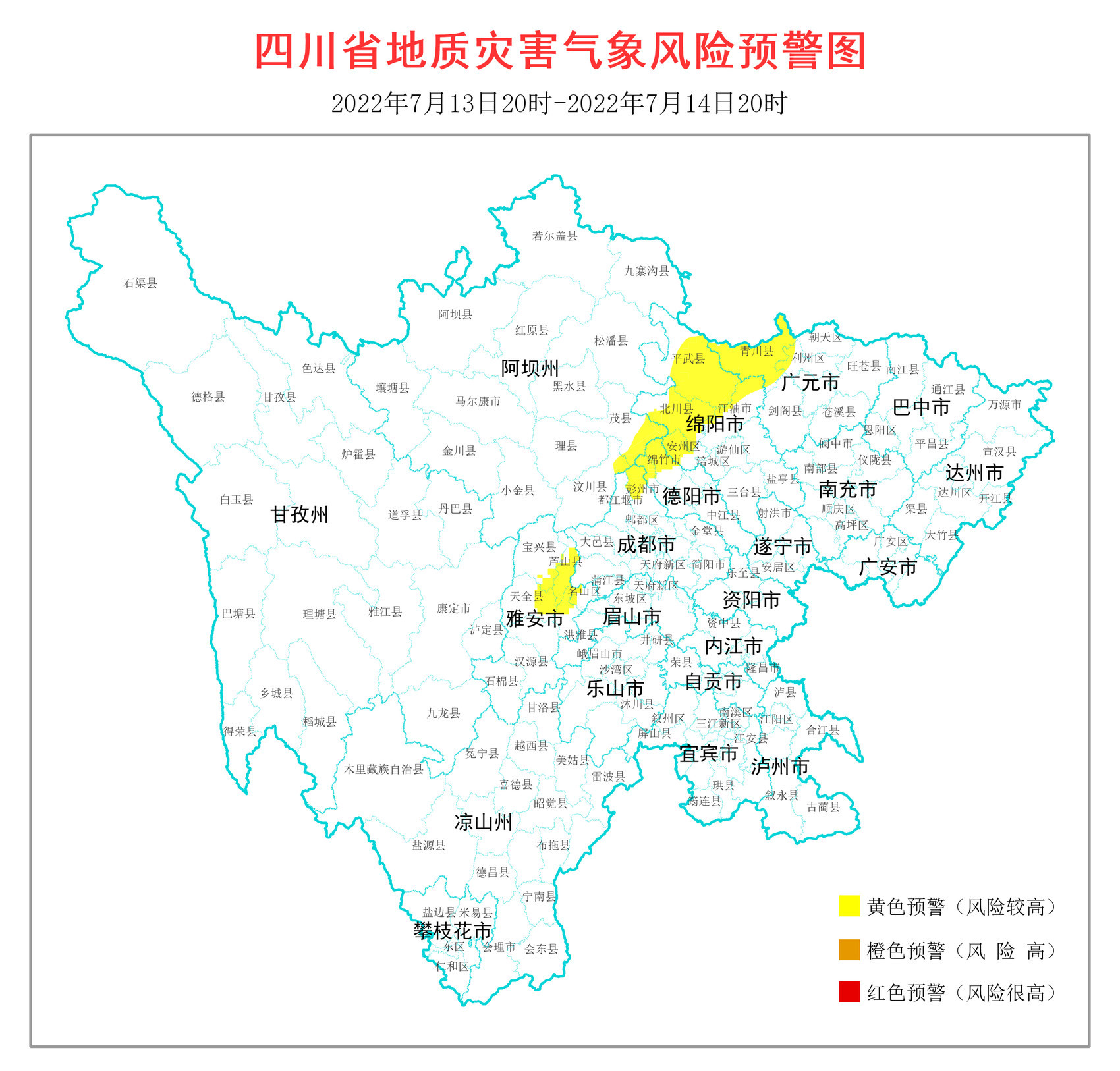 根据四川省地质环境条件,结合四川省气象台天气预报情况,7月13日,四川省地质灾害指挥部办公室发布地质灾害气象风险黄色预警,涉及6市(州)16个县(市、区)。
