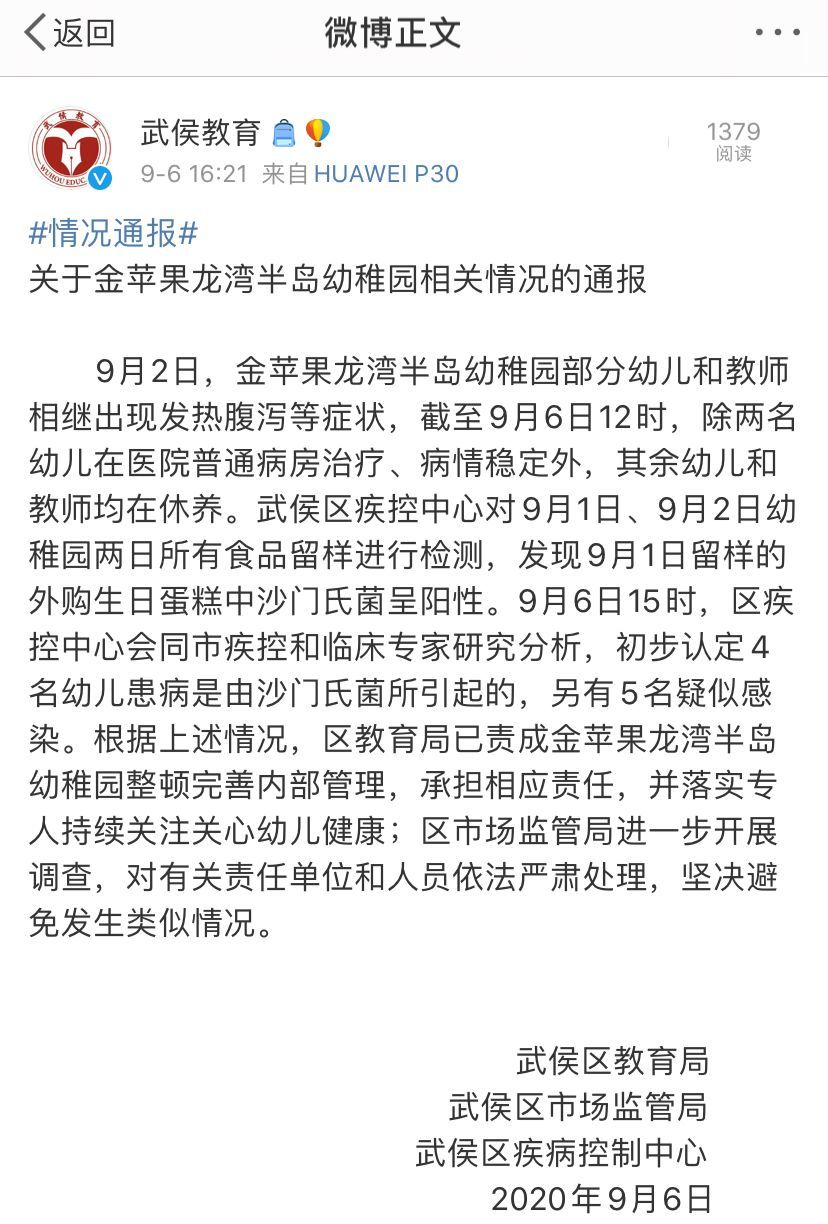 9月2日,金苹果龙湾半岛幼稚园部分幼儿和教师相继出现发热腹泻等症状,截至9月6日12时,除两名幼儿在医院普通病房治疗、病情稳定外,其余幼儿和教师均在休养。武侯区疾控中心对9月1日、9月2日幼稚园两日所有食品留样进行检测,发现9月1日留样的外购生日蛋糕中沙门氏菌呈阳性。9月6日15时,区疾控中心会同市疾控和临床专家研究分析,初步认定4名幼儿患病是由沙门氏菌所引起的,另有5名疑似感染。根据上述情况,区教育局已责成金苹果龙湾半岛幼稚园整顿完善内部管理,承担相应责任,并落实专人持续关注关心幼儿健康;区市场监管局进一步开展调查,对有关责任单位和人员依法严肃处理,坚决避免发生类似情况。