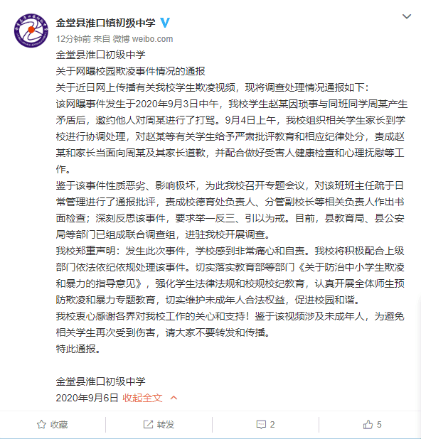 该网曝事件发生于2020年9月3日中午,我校学生赵某因琐事与同班同学周某产生矛盾后,邀约他人对周某进行了打骂。9月4日上午,我校组织相关学生家长到学校进行协调处理,对赵某等有关学生给予严肃批评教育和相应纪律处分,责成赵某和家长当面向周某及其家长道歉,并配合做好受害人健康检查和心理抚慰等工作。