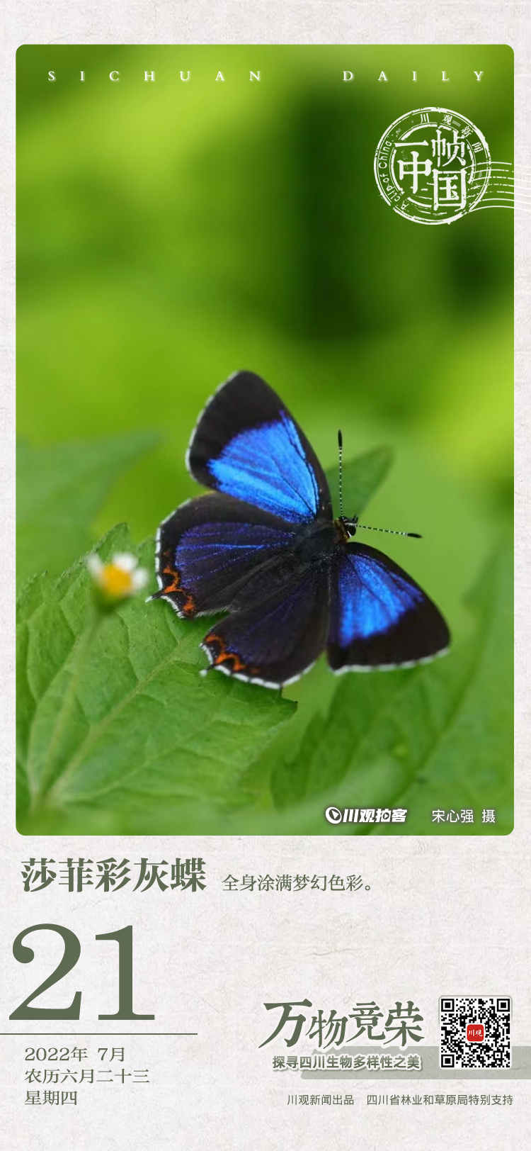 初听莎菲彩灰蝶这个名字,感觉真是洋气十足。其实它还有一个非常接地气的名字,叫“翠蓝黄灰蝶”,你一听大概就能够脑补出它的配色了。想象一下,明媚的阳光下,几只莎菲彩灰蝶翩翩飞舞,翅膀扇动间蓝光闪闪,璀璨夺目,犹如几个蓝色的小精灵在起舞。