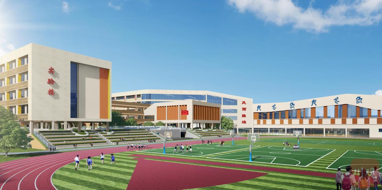 项目包含教学楼、实验楼、阶梯教室、风雨操场/食堂、篮球场、足球场、地下车库等建筑,其中,考虑项目西侧为城市体育活动公园,将学校运动区设置在西侧,后期公园成型后,两项目在特殊时段可以相互共享体育场地,将资源利用最大化。教学楼首层局部架空,将设置看书台、乒乓球、绿植、攀爬斜坡、动画图案等为学生提供丰富的风雨活动空间。