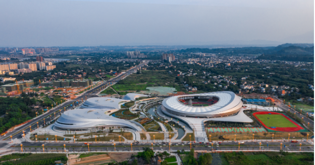 乐山市奥林匹克中心位于乐山市中区苏稽镇,四川省第十四届运动会、四川省第十届残疾人运动会暨第五届特殊奥林匹克运动会将于今年8月在这里开幕。项目建设内容包含“一场三馆”(体育场、体育馆、游泳馆、综合训练馆)、产业配套用房、地下车库和设备用房、室外运动场地等。项目总占地面积约339亩,建筑面积约20.78万平方米,设计可容纳近4万名观众。