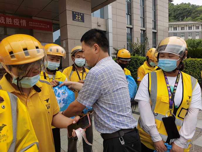 7月19日,剑阁县总工会首次为部分新就业形态劳动者——网约送餐员举行了“清凉包”发放仪式。县总工会党组书记、常务副主席张永钦、县市场监管局局长李霞参加发放仪式。