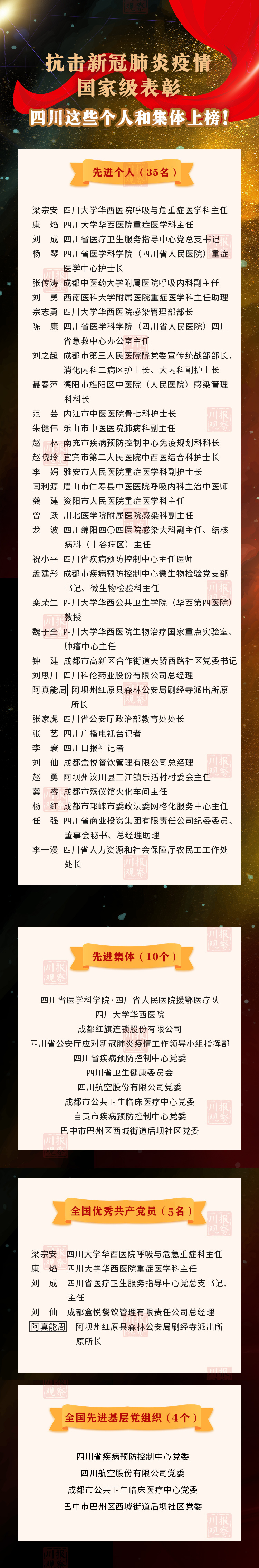 其中,四川省有梁宗安等35人被表彰为全国抗击新冠肺炎疫情先进个人,四川省医学科学院(四川省人民医院)援鄂医疗队等10个集体被表彰为全国抗击新冠肺炎疫情先进集体,梁宗安等5人被表彰为全国优秀共产党员,四川省疾病预防控制中心党委等4个集体被表彰为全国先进基层党组织。