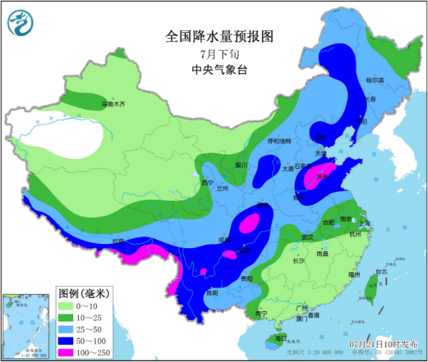 根据中央气象台预报,7月下旬,西北地区东部、西南地区东部、华北、东北地区中西部、黄淮等地累计降雨量有20~40毫米,部分地区有60~120毫米,局地150毫米以上;上述地区降水量较常年同期偏多,我国其余大部地区降水量偏少。