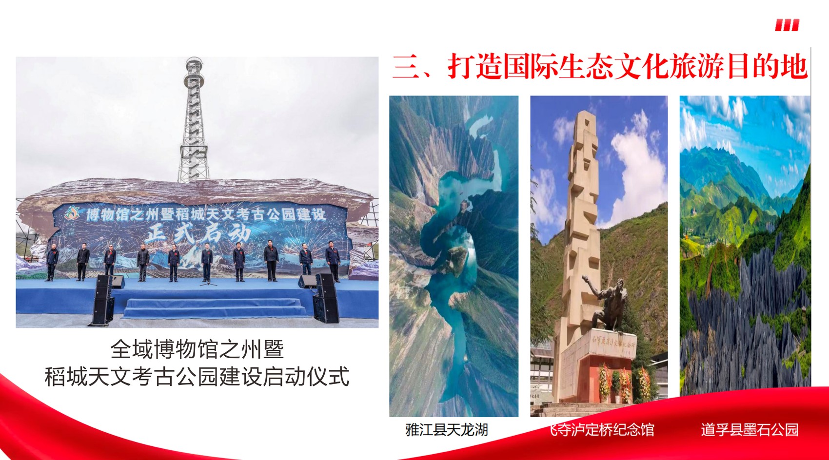 围绕打造国际生态文化旅游目的地,甘孜州首次召开文化和旅游发展大会,出台文旅发展10条激励措施,启动全域博物馆之州、稻城天文考古公园建设。