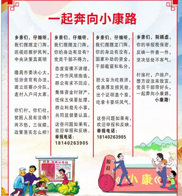 为提高群众对巡察工作的知晓率和参与度,切实提升巡察工作影响力,隆昌市委巡察办积极探索宣传新方法,加大巡察工作宣传力度,营造良好的巡察氛围。巡察办根据巡察内容的特殊性,因地制宜,将巡察关注的重点内容编辑成群众喜闻乐见快板,通过“村村响”循环播放,并将快板内容制作成通俗易懂的宣传画,从听觉、视觉直面传达给群众,让基层广大群众更直接、更深入地了解巡察工作,更广泛地参与巡察全过程。
