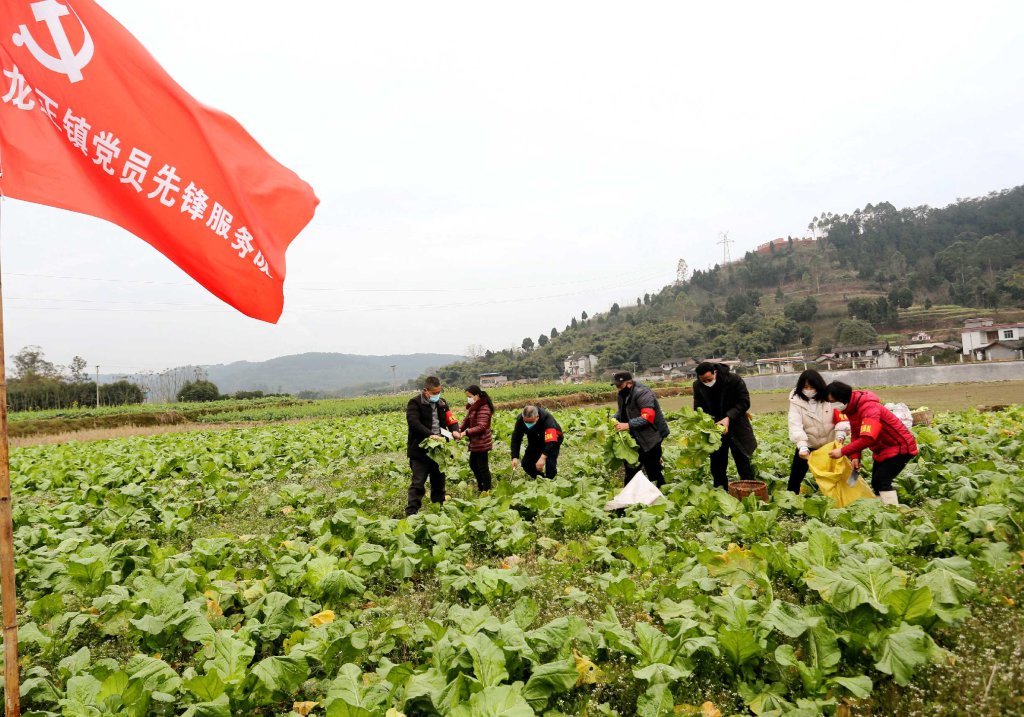 仁寿县龙正镇美满村一蔬菜地,镇村党员干部和邻居正在帮助隔离户抢收青菜。 潘建勇 摄(视觉四川)