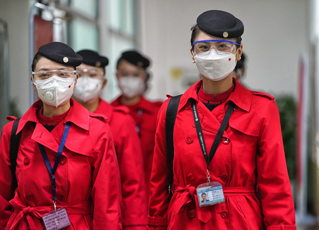 2月9日下午,川航3U3103航班运送四川省第六批援助湖北医疗队前往武汉,本次机组由英雄机长刘传健带队,乘务长蒋亚楠(右一)作为机组成员之一参加此次保障任务。 川报观察记者 尹钢 摄