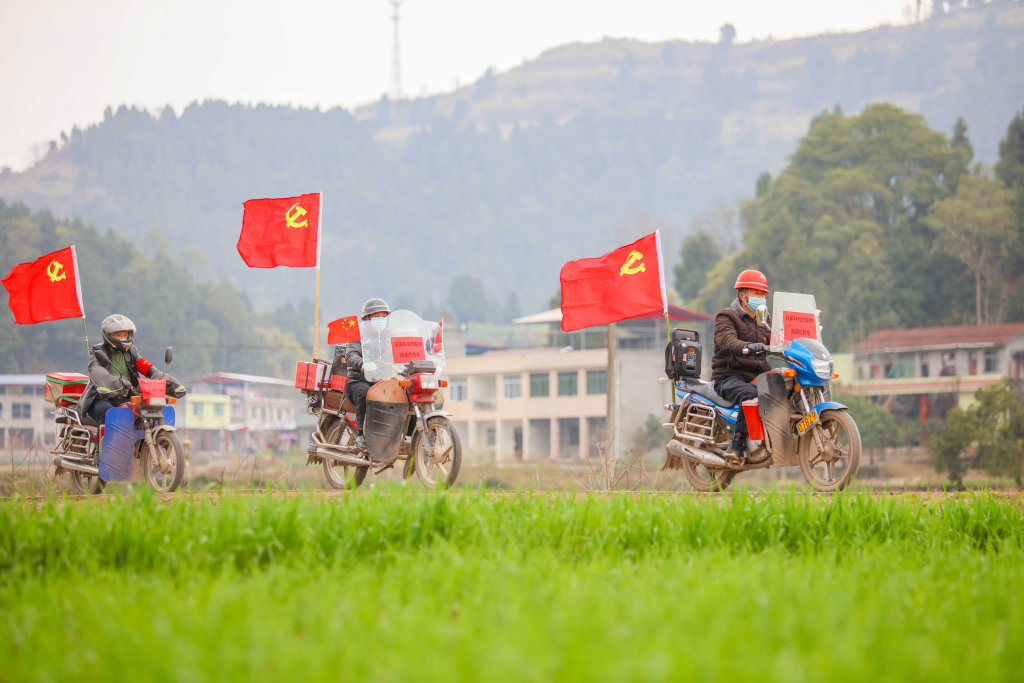 疫情期间,射洪市涪西镇的10余名党员干部骑着摩托车走村入户,宣传防疫知识。刘昌松 摄(视觉四川)