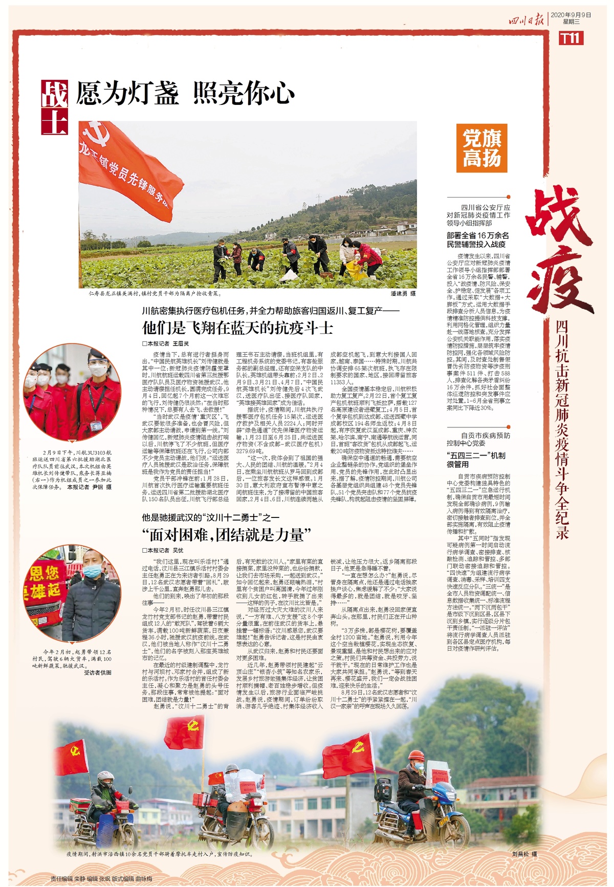 党员干部冲锋在前:1月28日,川航首次执行医疗运输重要航班任务,运送四川省第二批援助湖北医疗队150名队员出征,川航飞行部总经理王书石主动请缨,当班机组里,有工程机务系统的党委书记,有客舱服务部的副总经理,还有空保支队的中队长。英雄机组带头靠前:2月2日、2月9日、3月21日、4月7日,“中国民航英雄机长”刘传健先后4次飞武汉,送医疗队出征、接医疗队回家,“英雄接英雄回家”成为流传的佳话。