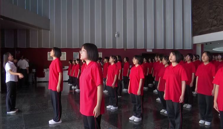 参观结束后,备受激励的师生们整齐列队,唱响《没有共产党就没有新中国》《英雄赞歌》《万疆》等歌曲,歌声在馆内激荡。