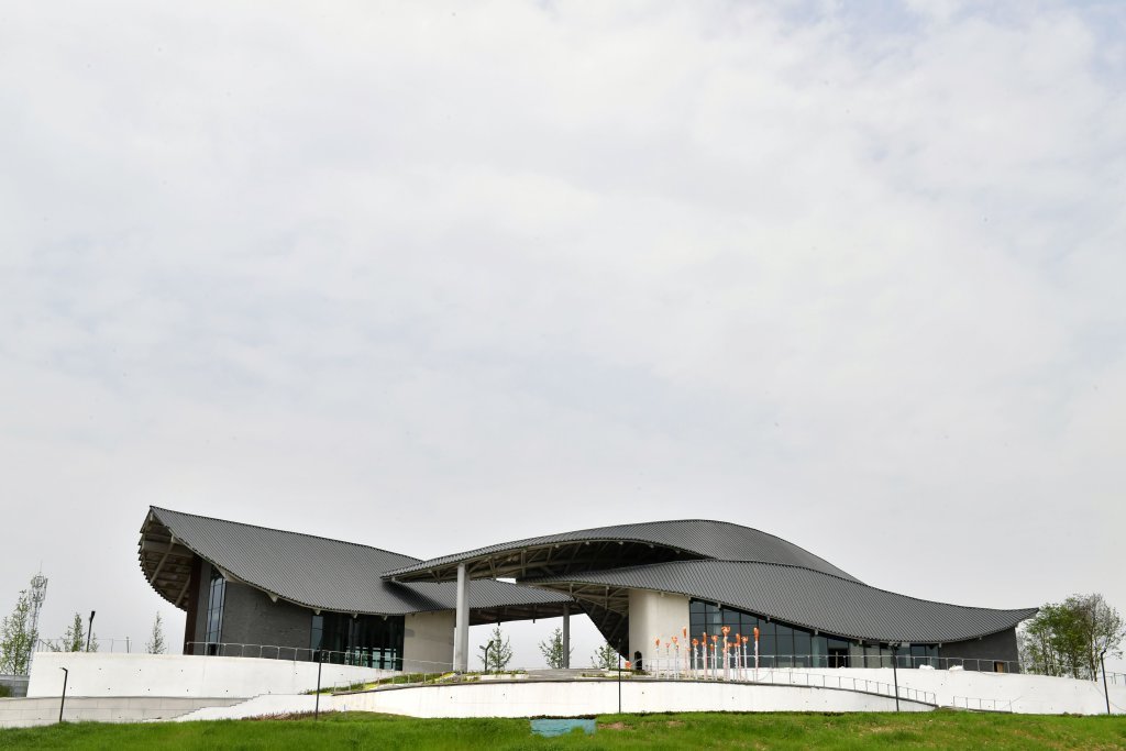 车辆还未行驶到村口,远远就能看见一座造型独特的建筑,黑灰色的单层小楼伫立在平坦的地面,青黑色的屋顶上,几道弧线轻盈起伏,在中心处交汇,古意盎然。