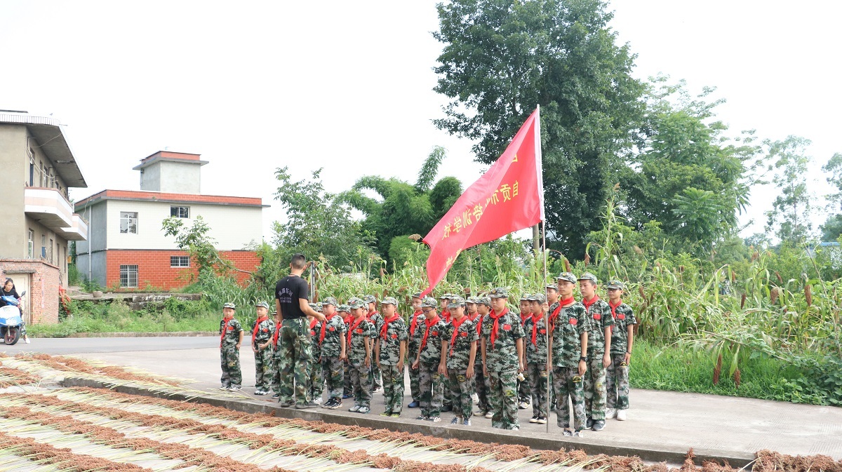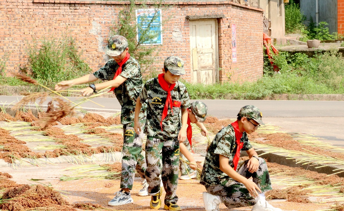 在青山环绕的三河村,小朋友们穿着迷彩服,戴着红领巾,背上背篓,拿起簸箕,带上镰刀到集体经济产业园学习、体验收割高粱的乡村生活乐趣。