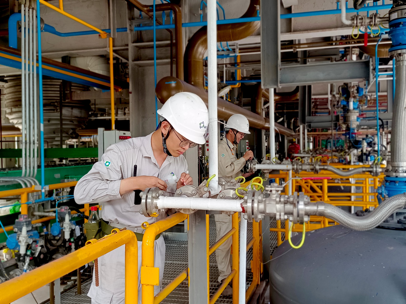 7月21日,乐山协鑫10万吨颗粒硅项目正式投产。图为投产前某工段员工仔细排查漏点。 拍摄:宋思蓓