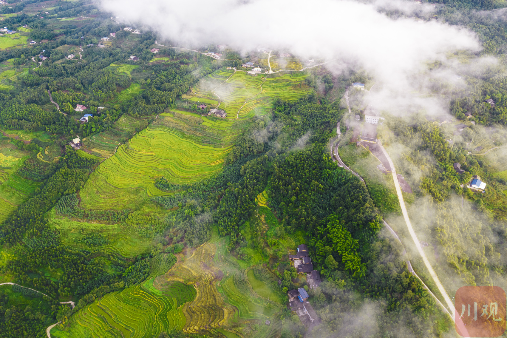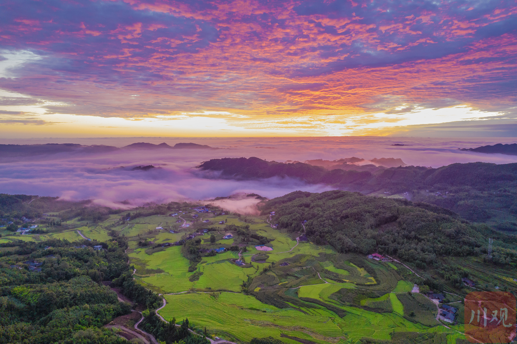 盛夏清晨,几场山雨过后,远山翠黛迤逦,无边的云海漫过千山,涌过万岭,裹挟着天地间的性灵,来到四峨。红日、霞光、云雾、群峰、梯田共同挥笔,画就四峨的灵秀壮美。