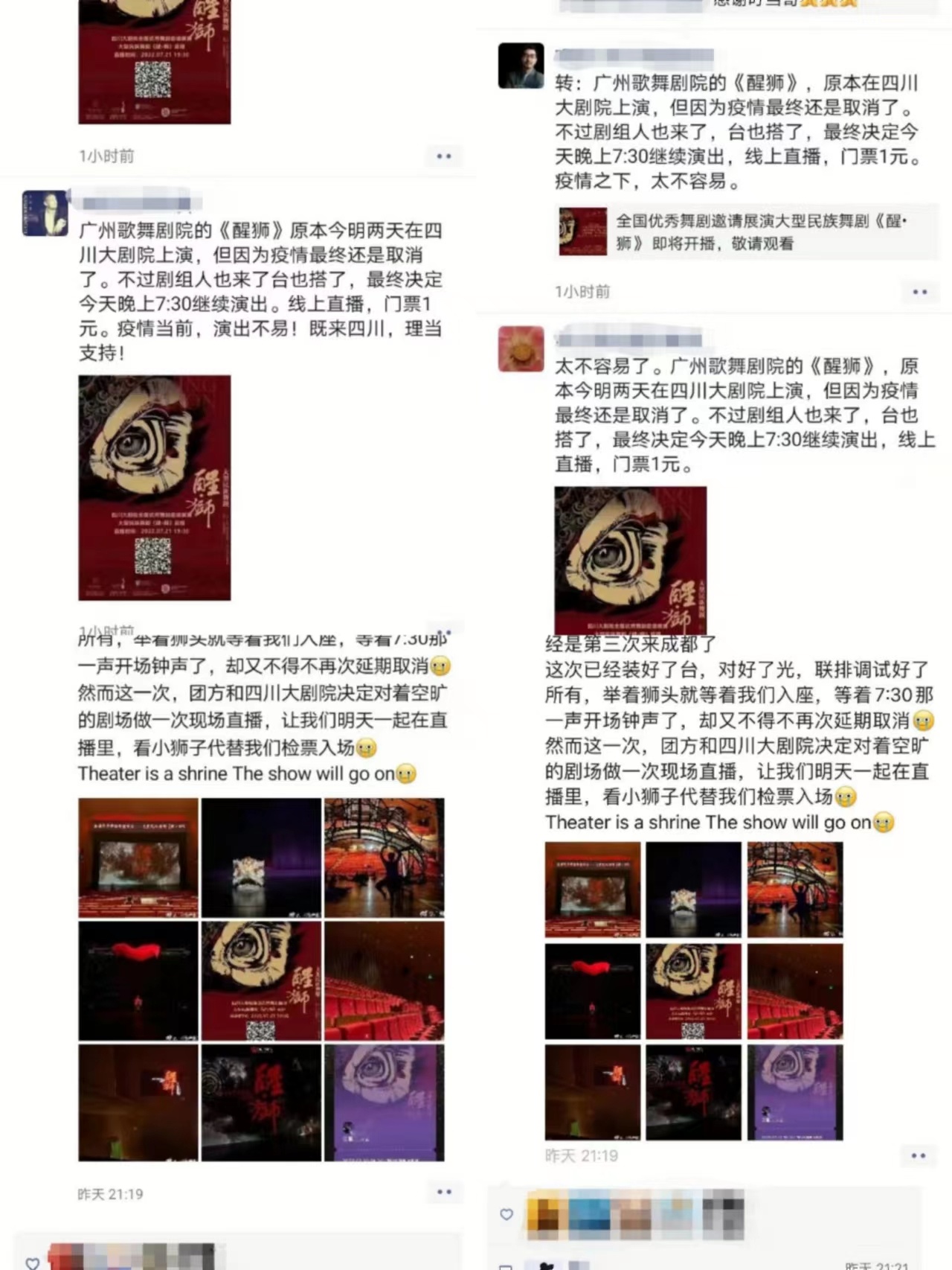 配上《醒·狮》的演出预约海报,其中转发最多的文案是:“广州歌舞剧院的《醒·狮》,原本在四川大剧院上演,但因为疫情最终还是取消了。不过剧组人也来了,台也搭了,最终决定今晚上7点半继续演出,线上直播,门票1元,疫情之下大家都太不容易了。”