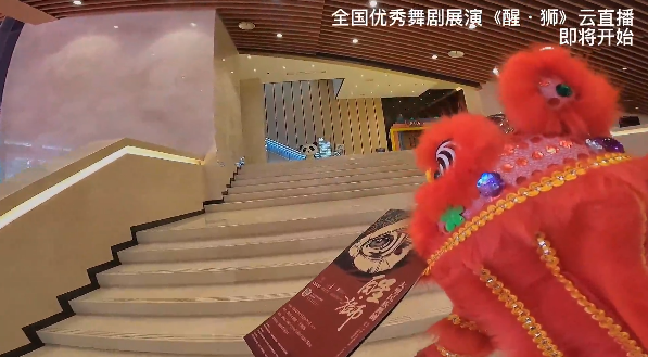 7点20分,一头红色小狮子登上大剧院门口,它可爱地摇着头,口里叼着《醒·狮》的演出节目单,兴致勃勃地来到剧场门口,路过核酸检测点,走向剧场。当晚19点30分,跟着小狮子的步伐,网友们来到《醒·狮》舞台幕布前,开启线上观演。