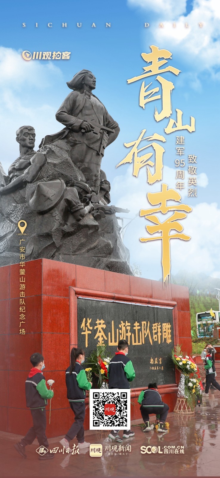 “华蓥山游击队用鲜血与生命铸就了伟大的‘红岩精神’”。广安华蓥市双河小学的少先队员在红岩广场“华蓥山游击队群雕”前献花,缅怀革命先烈。