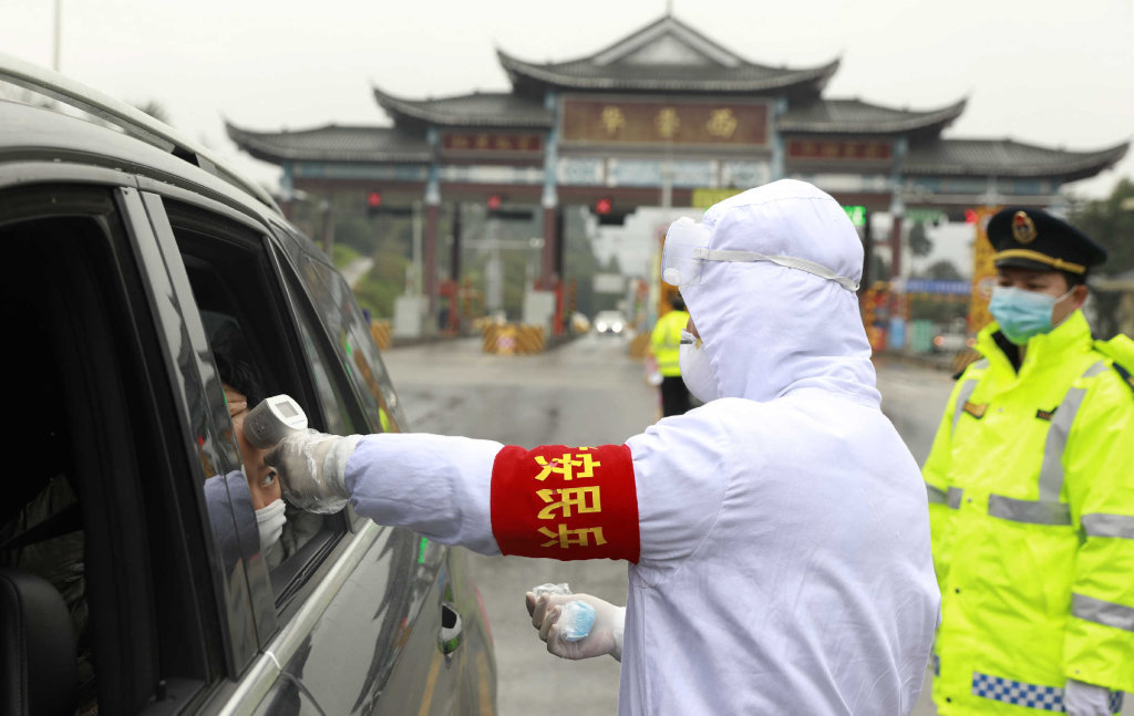 2月3日,广安华蓥市双河街道的民兵,正在华蓥西站高速路出入口严防细查过往车辆及人员。 游青 摄(视觉四川)