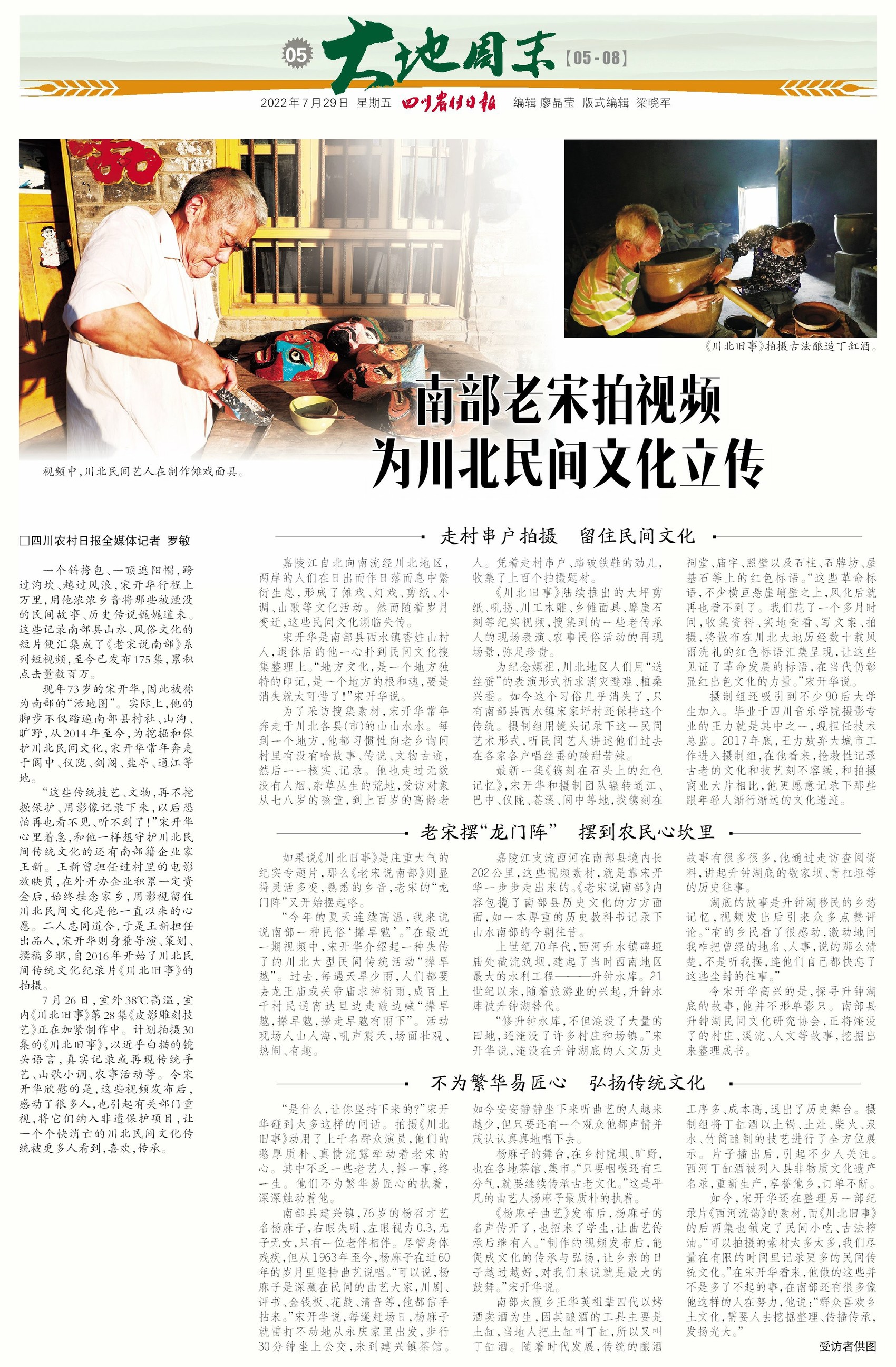一个斜挎包、一顶遮阳帽,跨过沟坎、越过风浪,宋开华行程上万里,用他浓浓乡音将那些被湮没的民间故事、历史传说娓娓道来。这些记录南部县山水、风俗文化的短片便汇集成了《老宋说南部》系列短视频,至今已发布175集,累积点击量数百万。