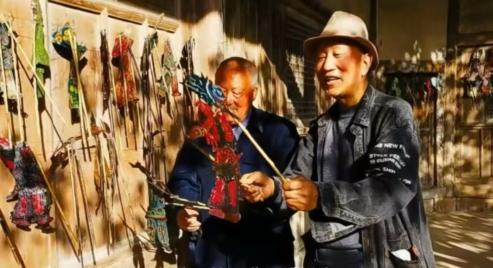 宋开华(右)拍摄《皮影雕刻技艺》花絮。