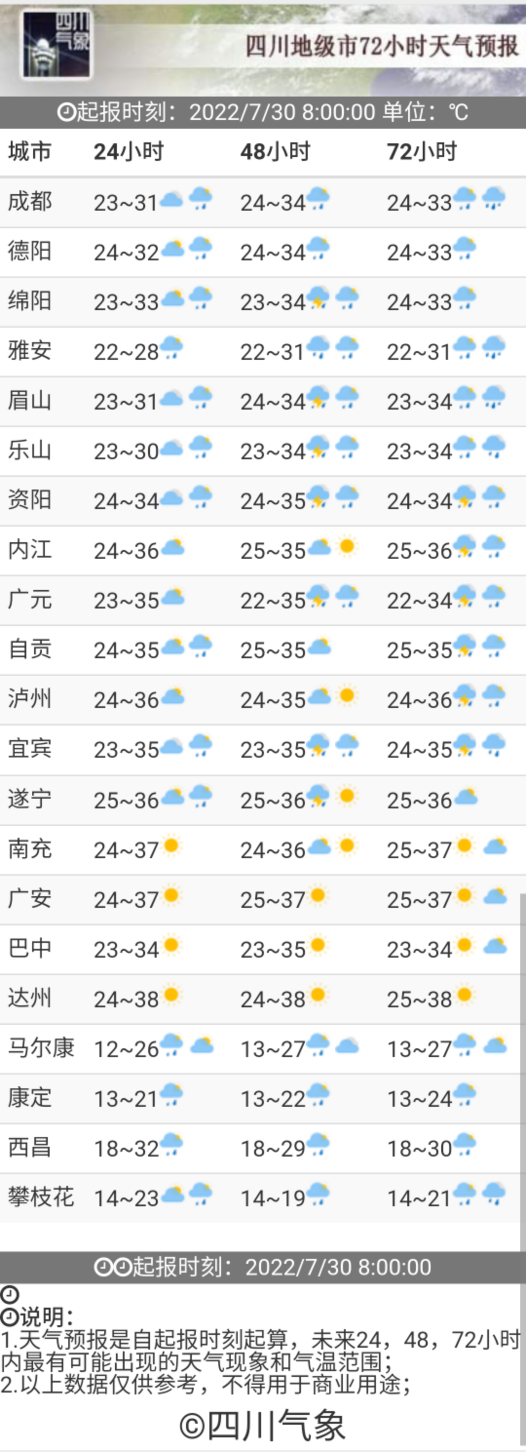 7月30日,截至14时,四川各地气象台发布的高温橙色预警信号涉及地方如下↘