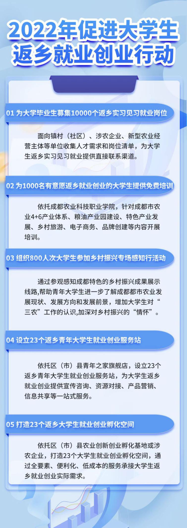 共青团成都市委相关负责人介绍,为促进大学生返乡就业创业,本次行动全年将收集发布不少于10000个大学生返乡实习见习就业岗位,帮助缓解青年大学生就业压力,也为成都全面建设践行新发展理念的公园城市示范区和推动成都乡村振兴工作持续汇聚青年人才。相关就业岗位清单根据镇村(社区)、涉农企业、农村新型经营主体的人才需求梳理形成,将通过多平台发布,为大学生返乡实习见习就业提供直接联系渠道。