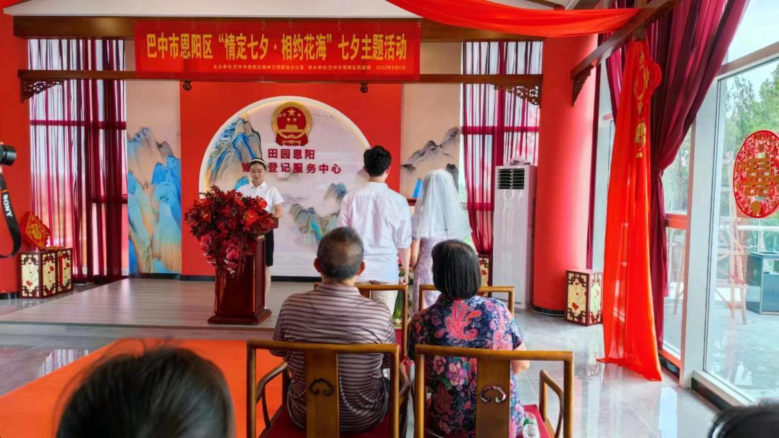 8月4日,巴中市恩阳区民政局田园恩阳婚姻登记服务中心颁证员引导新人宣读《结婚誓词》。