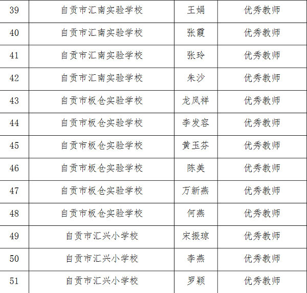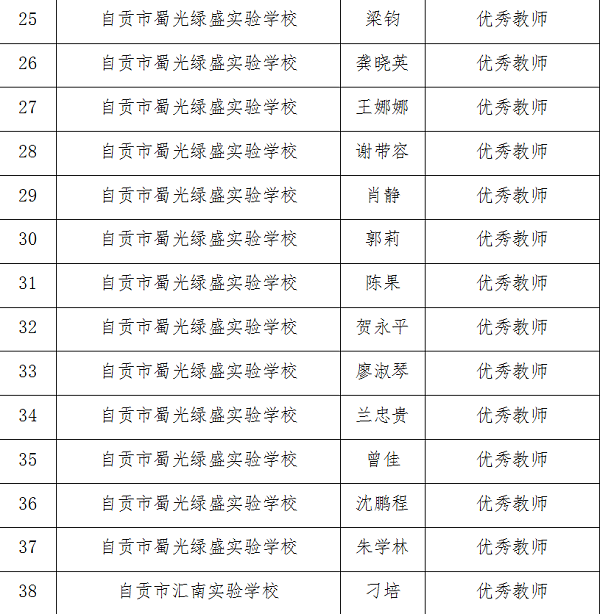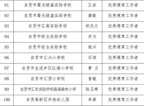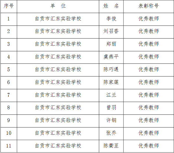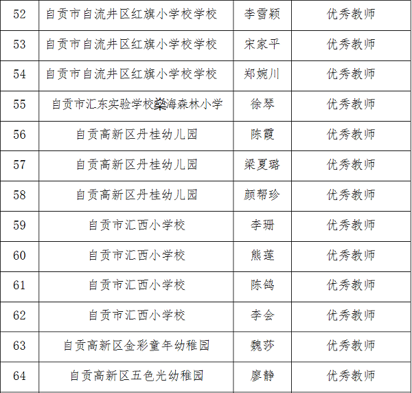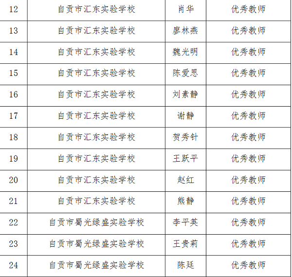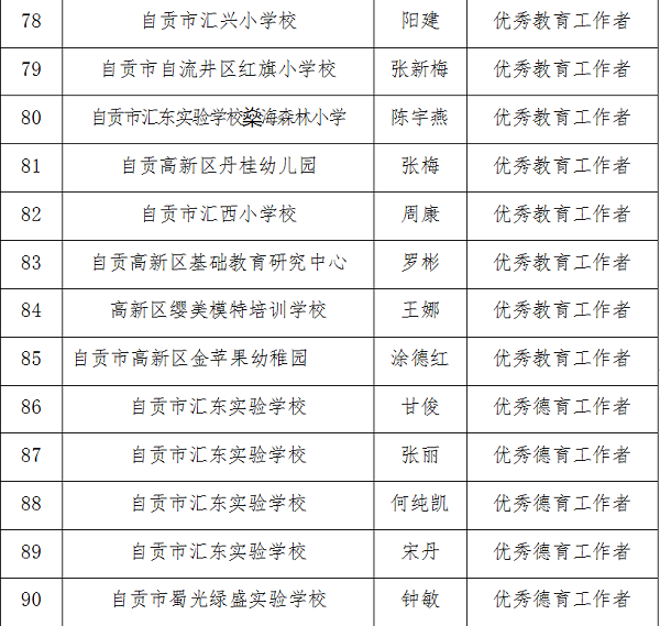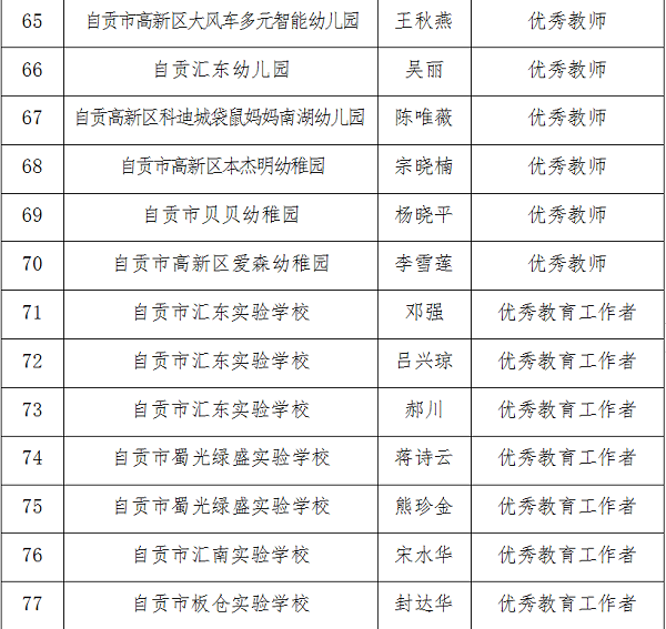 近年来,高新区广大教师切实推进教育教学改革和创新,不断创造新的业绩,涌现出一大批优秀的教育工作者。为弘扬尊师重教的良好风尚,增强教师的荣誉感和责任感,高新区管委会研究决定授予自贡市汇东实验学校李俊等70名同志优秀教师称号;自贡市蜀光绿盛实验学校蒋诗云等15名同志优秀教育工作者称号;自贡市汇南实验学校郑杰文等15名同志优秀德育工作者称号。