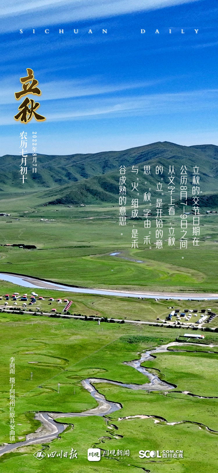 从文字上看,立秋的“立”是开始的意思,“秋”字由“禾”与“火”组成,是禾谷成熟的意思。民间认为,立秋表示暑去凉来、秋天开始之意。立秋时节,初有凉风,甚至会提前感知到丝丝凉意。