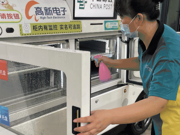 只见无人车邮政工作人员在小区门口给无人车进行整体消杀后,将当天要配送的邮件,包括一些生活物资逐一放进车里。此后,无人车按照既定路线只身进入小区,在接受指令后将车停在了单元门口,小区志愿者在屏幕上输入取件码后,车门自动打开,志愿者将该栋楼邮件及物资逐一拿下来,再送上楼即可。不到2个小时,鲁能城的邮件全部安全配送完成。