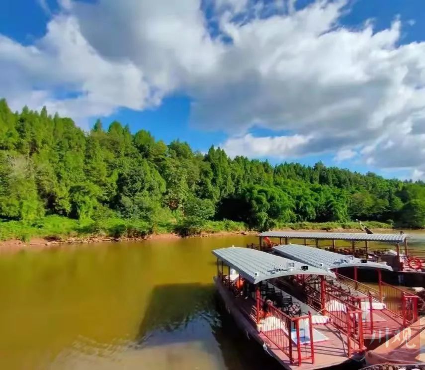 清澈的花溪河水穿山而过,蜿蜒流淌着两岸的秀丽风光。穿过黄谷码头,拾级而下乘坐游船,尽览两岸景色。波光粼粼的河面,游船划过一道道波纹,河风吹过耳畔,留下只属于天府花溪的细语。