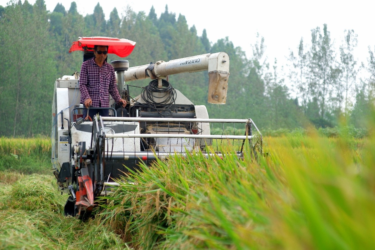 华辉家庭农场收割机将稻穗颗粒归仓。罗敏/摄
