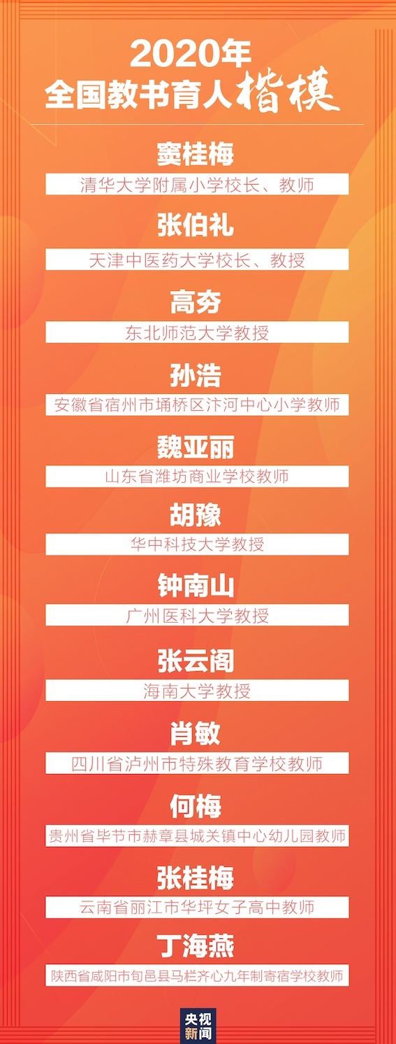 9月4日,2020年全国教书育人楷模名单发布,首次由中宣部和教育部联合表彰,首次增加2个优秀抗疫教师名额,共计推出12位“全国教书育人楷模”。