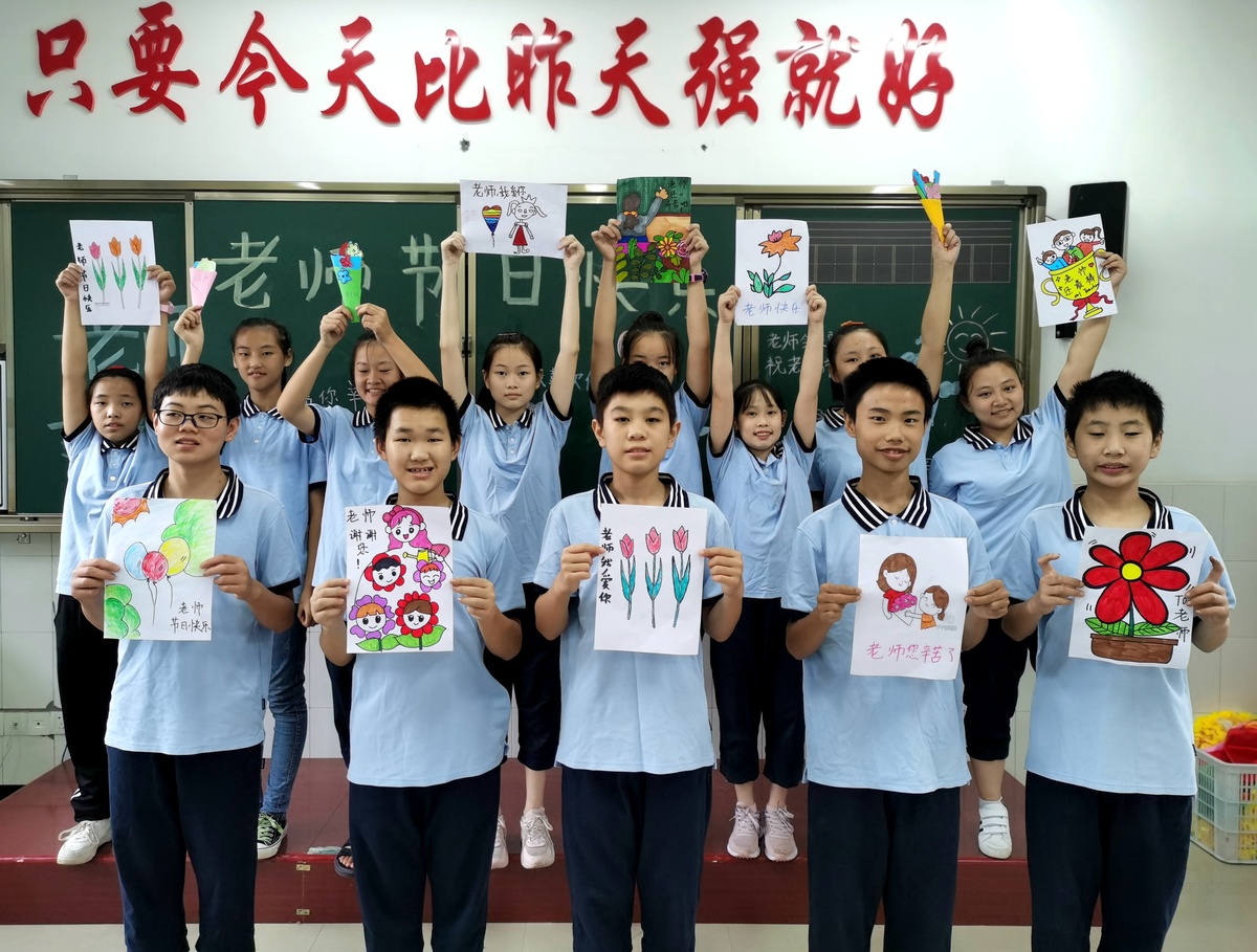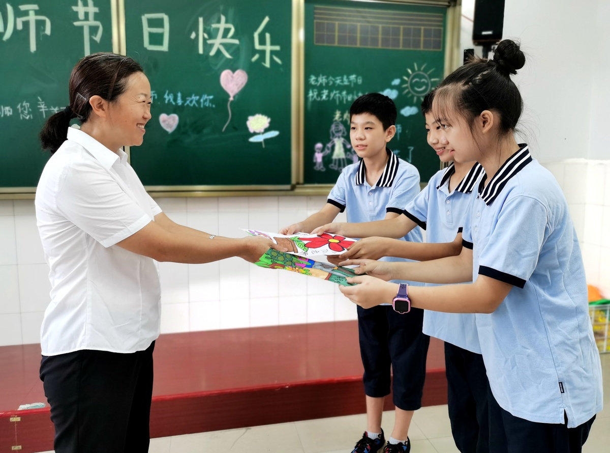“老师,您最棒!”“老师,谢谢您!”“老师,我爱您!”9月9日上午10时10分,59岁的孙绍玲刚刚走上讲台就收到了来自7年纪聋声班学生提前送来的一幅幅精美图画,无法开口说话的孩子在画上写满了祝福语。