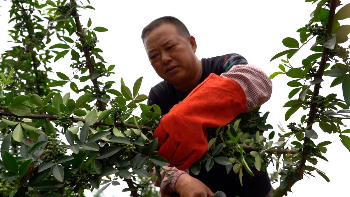 走进藤椒园,唐道德随手在树上摘下一串,“闻一闻,味道是不是很浓?收完最后的十几亩,今年收割就结束了!”