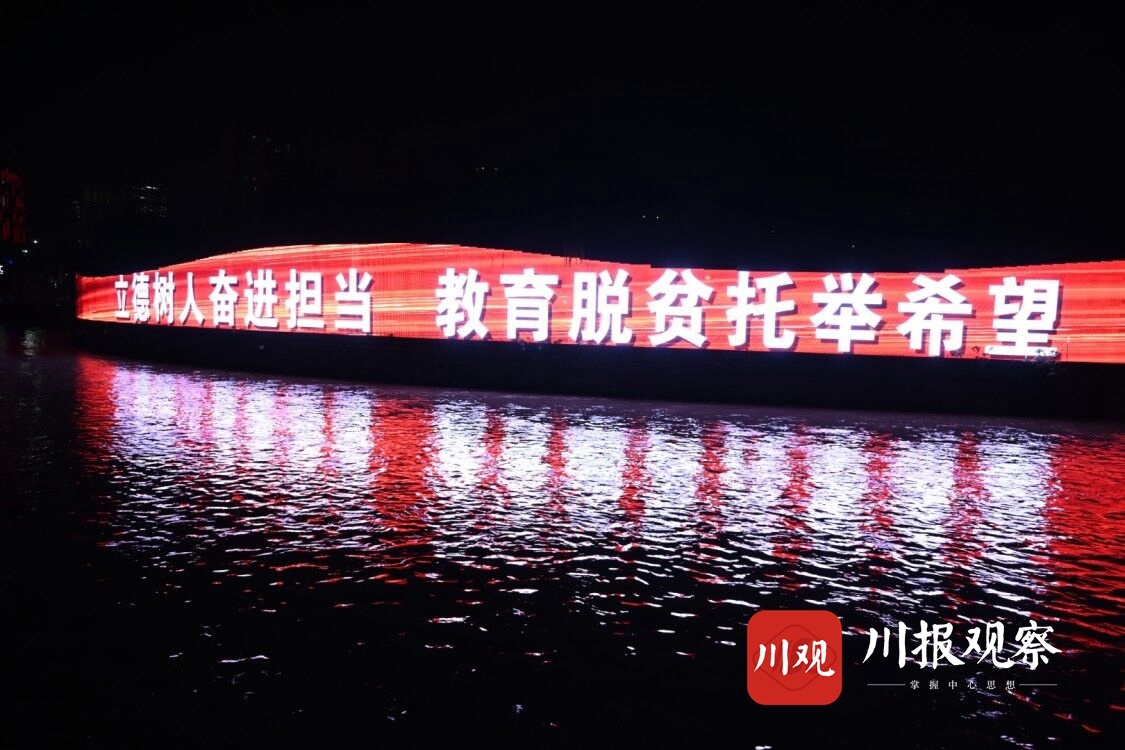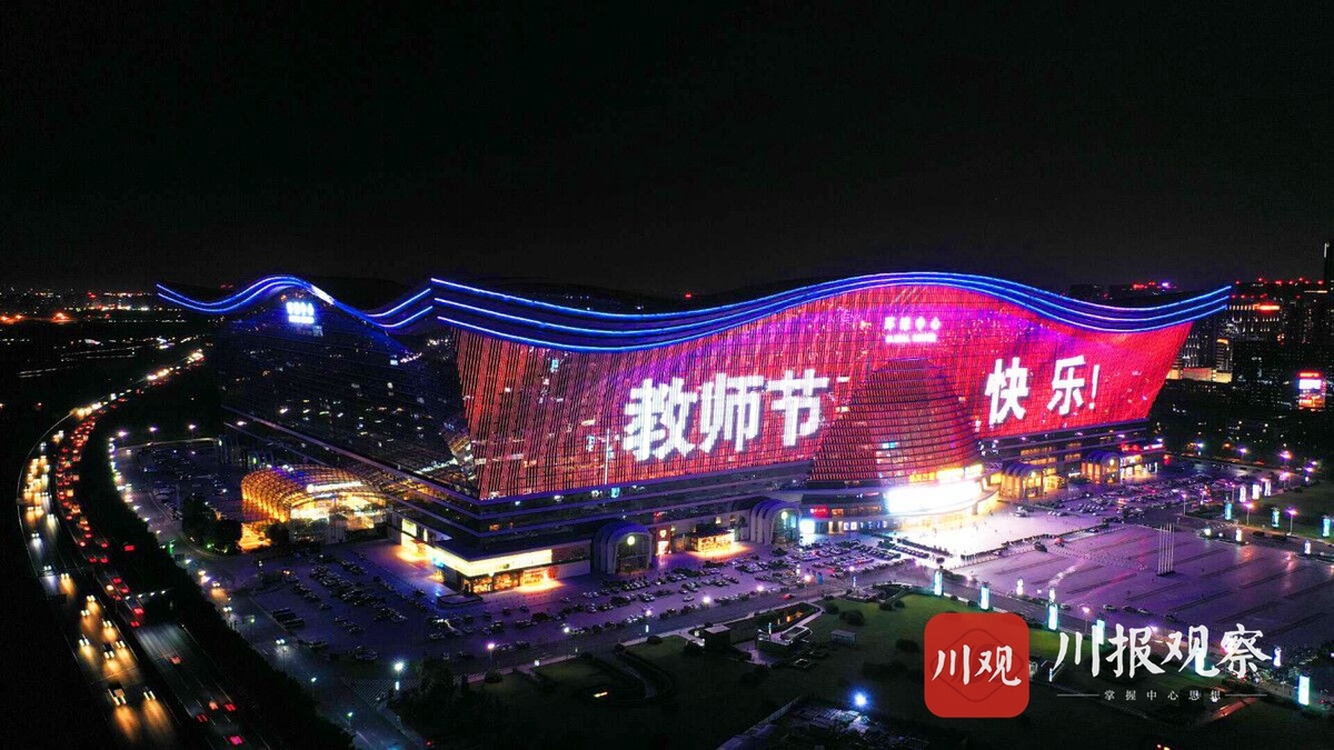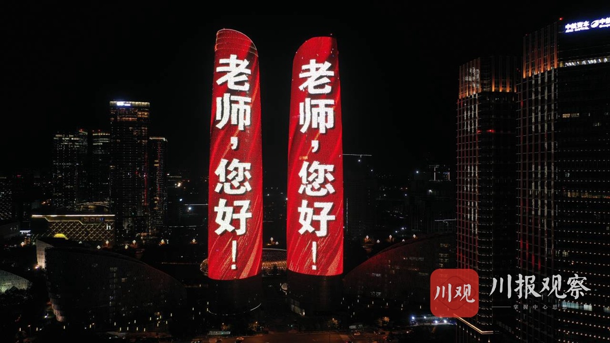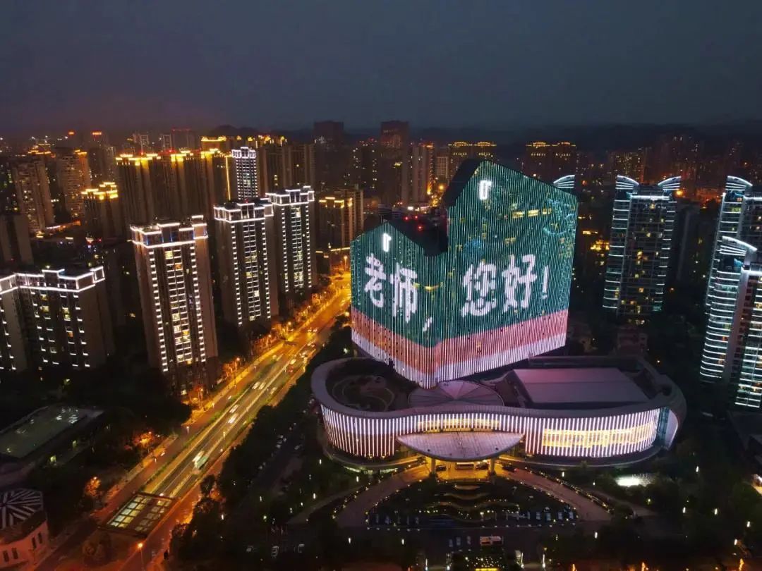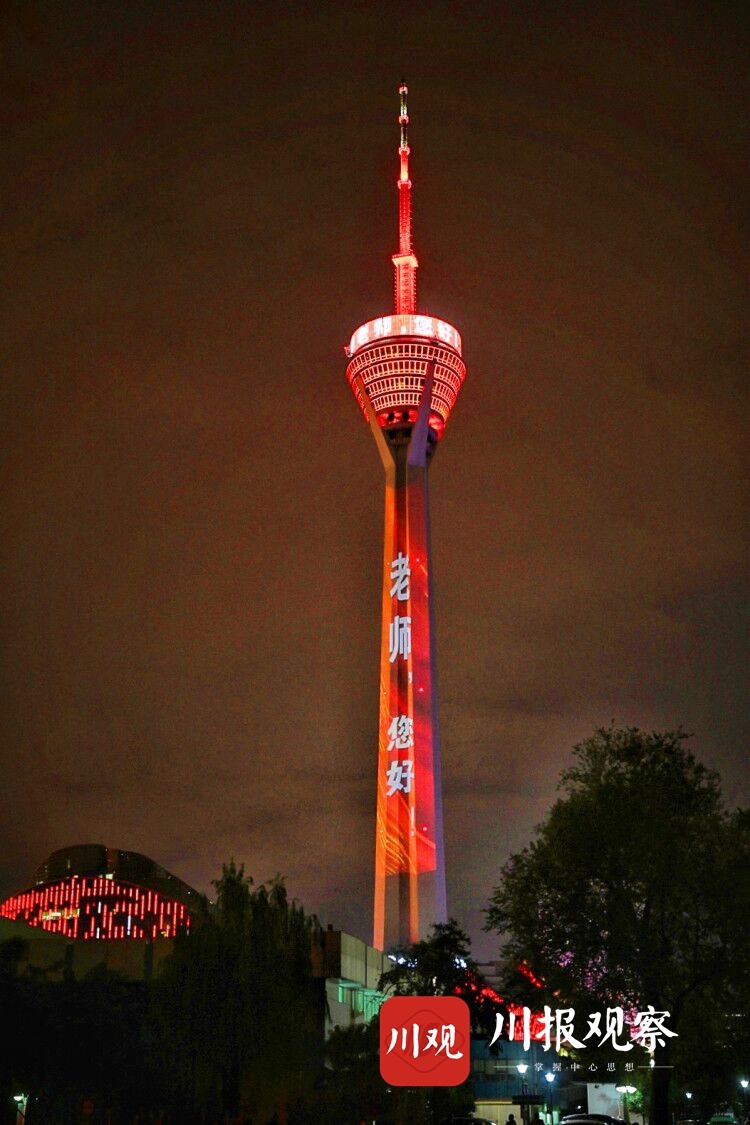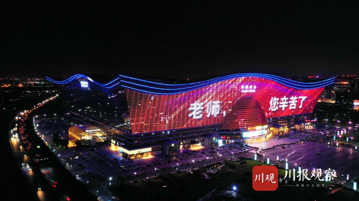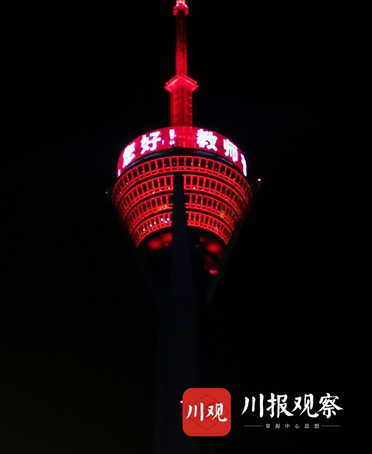 当晚,除了成都,全省各市(州)、县(市、区)的地标建筑,地域内带有电子显示屏的建筑或单位,以及各高校都参与到“为教师亮灯”活动中。