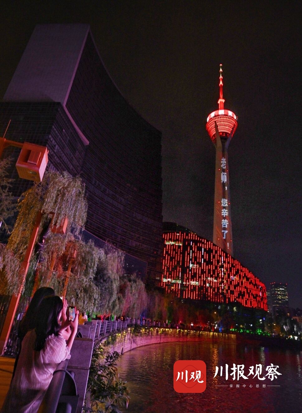 初秋的夜晚,成都339电视塔旁,美丽的府南河流光溢彩。在河边散步的市民李女士告诉记者,看到电视塔为教师亮灯、并滚动播放字幕祝福致敬,她很感动,“人类灵魂的工程师值得拥有最高的礼遇。”