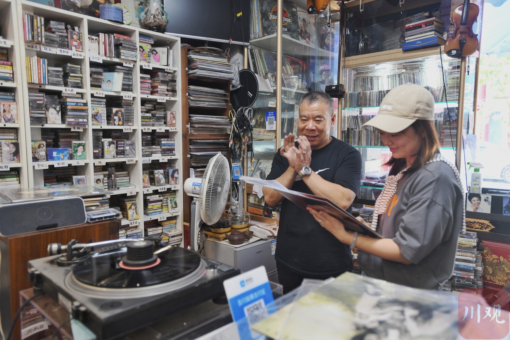 舒小染和朋友欧超今天一起从峨眉开车来店里。“平时喜欢民谣、蓝调、爵士类,歌手还是喜欢周杰伦,毕竟那个年代都是听周董的歌,还有张学友的歌。”挑出来6、7张黑胶片,第一次到店的舒小染很满意。“周董前段时间发的新歌,我在网上订的数字产品,总觉得不带劲,今天是专程过来,能触摸这些老胶片的质感,看到旋转的胶片流淌出来的乐曲,真的就像在现场聆听。”舒小染的朋友欧超说。另一对年轻人从店里翻出了不少老胶片,老高熟练地把唱片机盖打开,搭上唱针,旋律随着慢慢旋转的胶片在小店里荡漾开来,“可以呀!感觉来了!”年轻人听得陶醉了。