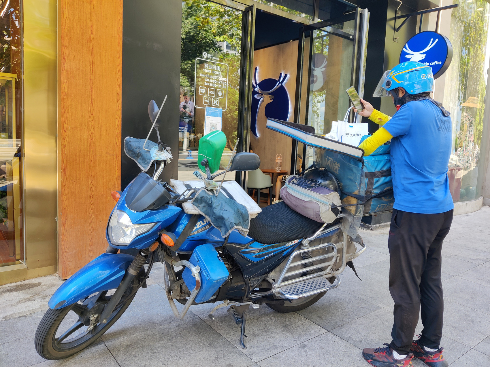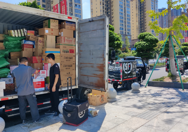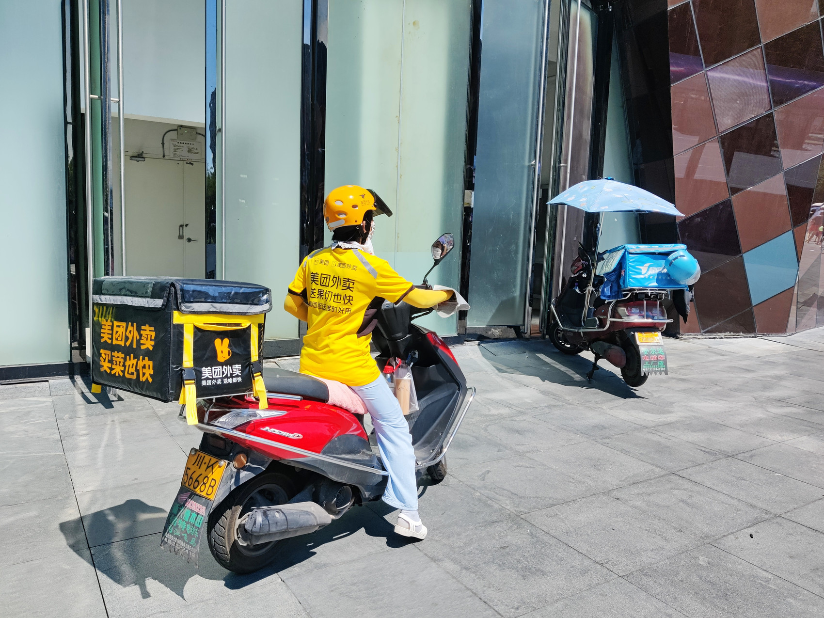 与外卖员穿行而过的还有快递配送员,他们冒着酷暑,只为将市民在网上选购的商品准时送达。除了常规包裹之外,最近时新的预制菜也时不时出现在派送路上。