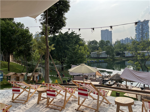 走过木板桥,沿着旋转楼梯往下,踩在沙滩质地的区域,太阳伞、躺椅、木桌,极具巴厘岛风格的画面呈现在眼前,这里就是位于麓客岛的放野玩水店,这片沙滩区域成为了许多年轻人的热门打卡地。再往下走,来到玩水区域,游客们正在湖面悠闲地骑着双人自行车。在这里,不仅可以玩水,还可以享受“假装在海边”的惬意,快来体验吧!