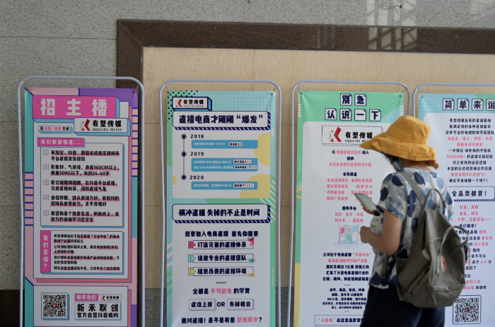 2020年8月9日,杭州九堡新禾联创工业园区内,一位女士正在浏览招聘主播的海报