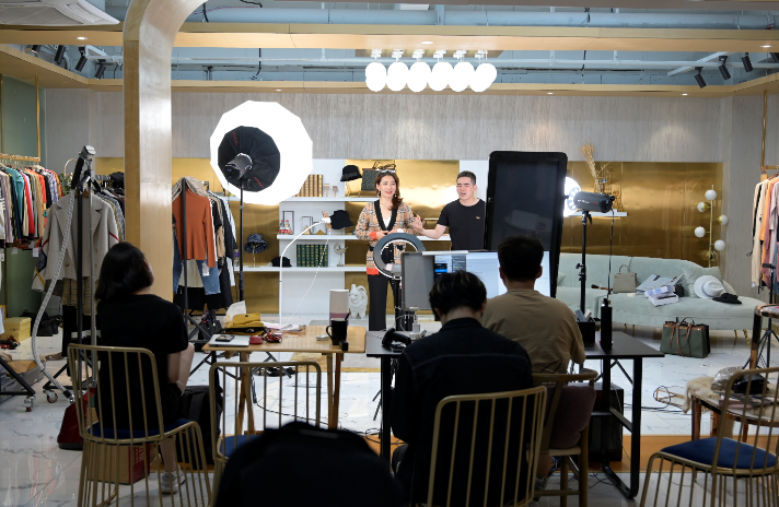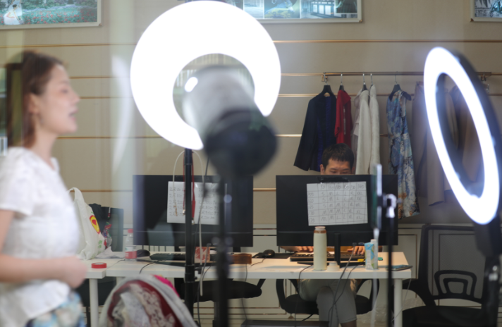 2020年8月9日,杭州九堡新禾联创工业园区内一家服装店内正在直播的主播和后台工作人员