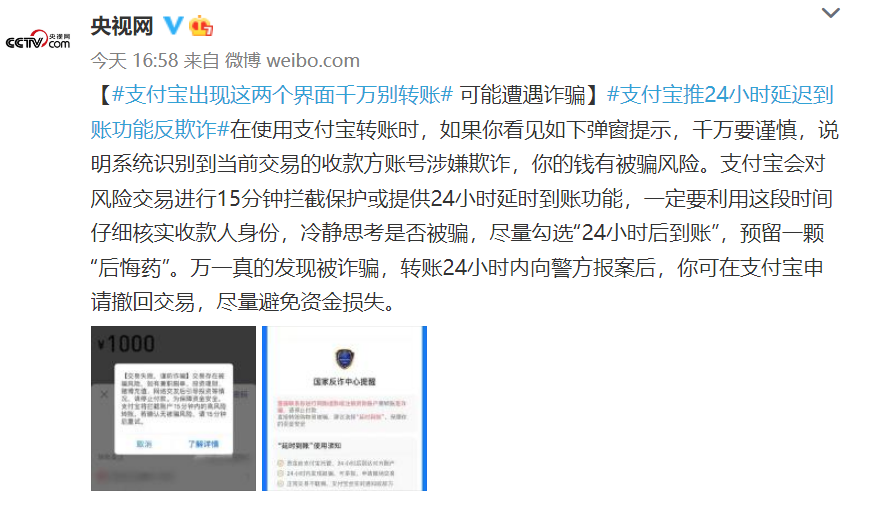 在使用支付宝转账时,如果你看见如下弹窗提示,千万要谨慎,说明系统识别到当前交易的收款方账号涉嫌欺诈,你的钱有被骗风险。支付宝会对风险交易进行15分钟拦截保护或提供24小时延时到账功能,一定要利用这段时间仔细核实收款人身份,冷静思考是否被骗,尽量勾选“24小时后到账”,预留一颗“后悔药”。万一真的发现被诈骗,转账24小时内向警方报案后,你可在支付宝申请撤回交易,尽量避免资金损失。