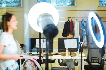 8月9日,杭州九堡新禾联创工业园区内,一家服装店内正在直播的主播和后台工作人员。