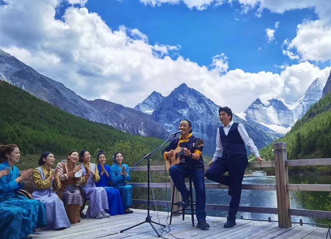 8月12日下午,甘孜州稻城县央迈勇神山下、圣水湖前,甘孜州石渠县藏族歌手索朗达吉和甘孜州文广旅局“网红”局长刘洪共同吟唱《我从亚丁来》《向往亚丁》等歌曲,受到众多关注。